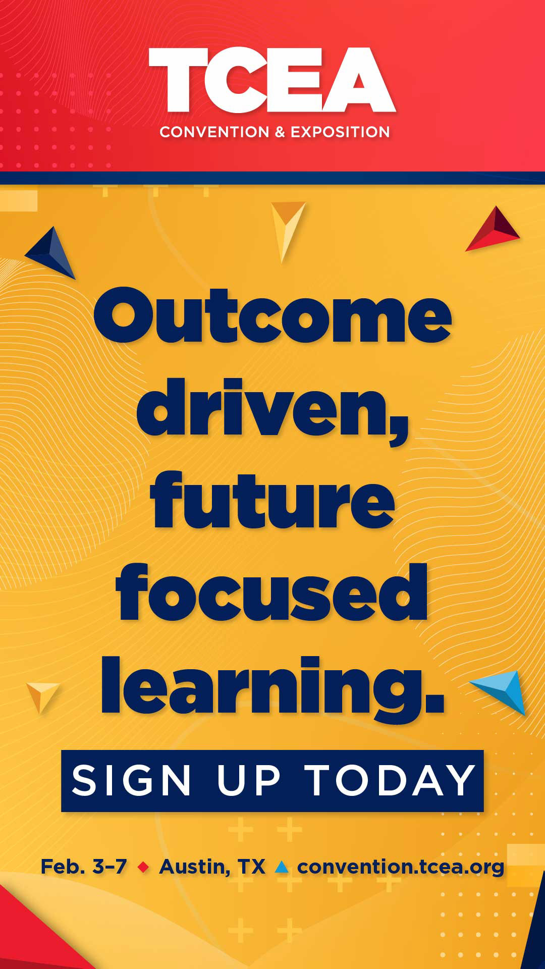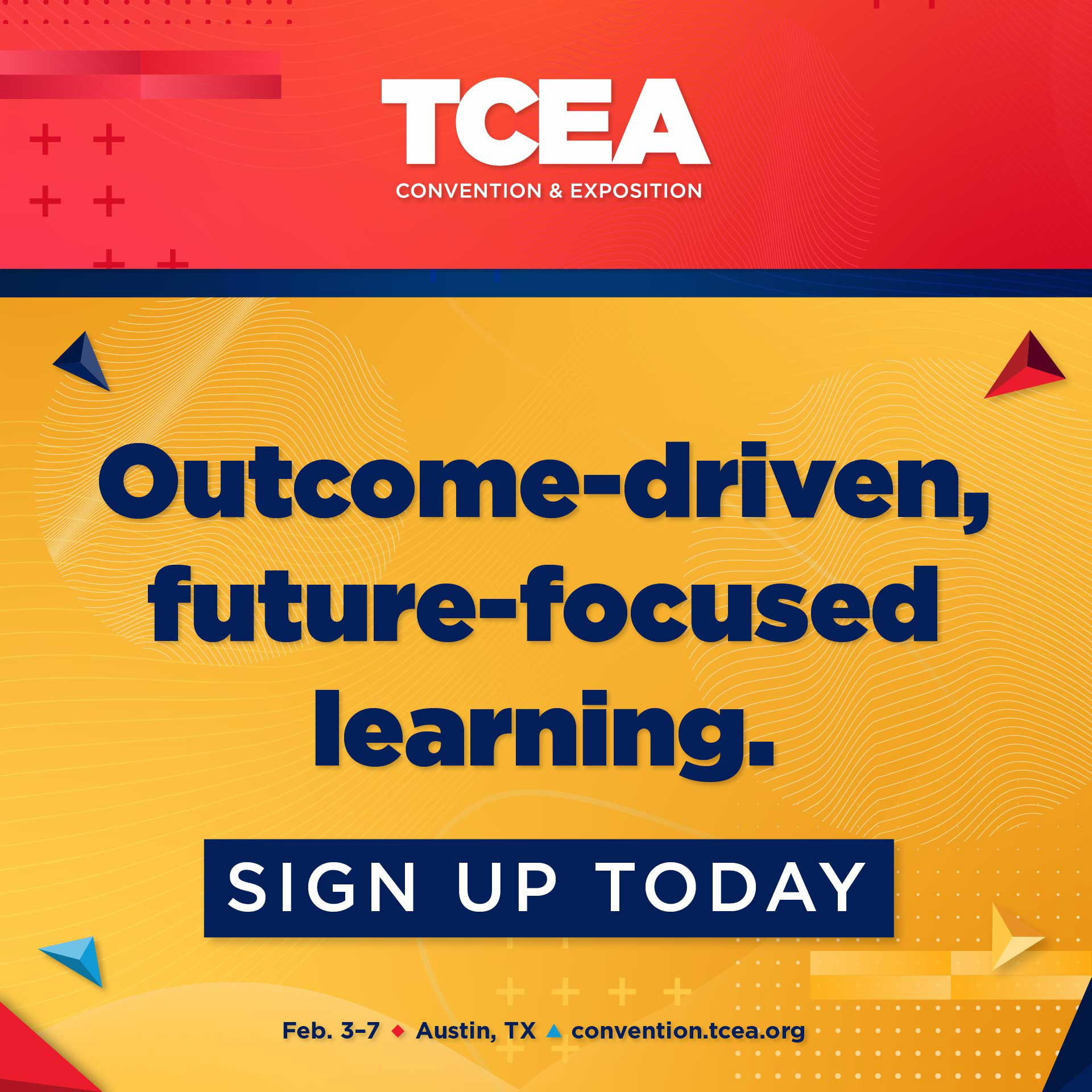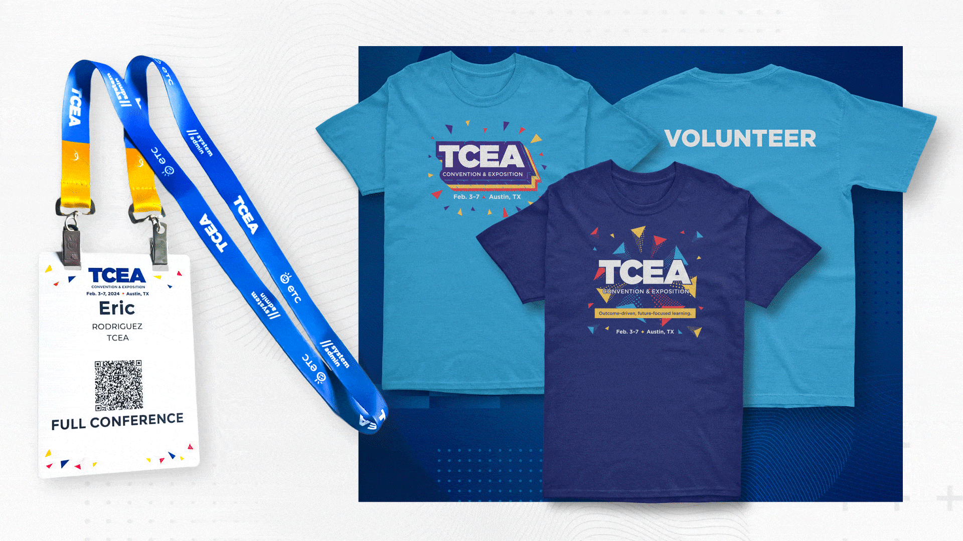 Each year, I designed the TCEA Convention brand using TCEA’s core primary red, blue, yellow, and navy colors while avoiding traditional education imagery. For 2024 I used abstract geometric textures and polygons to symbolize forward-thinking individuals and educators coming together to support one another.