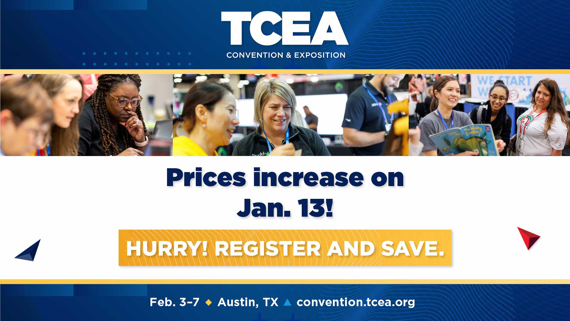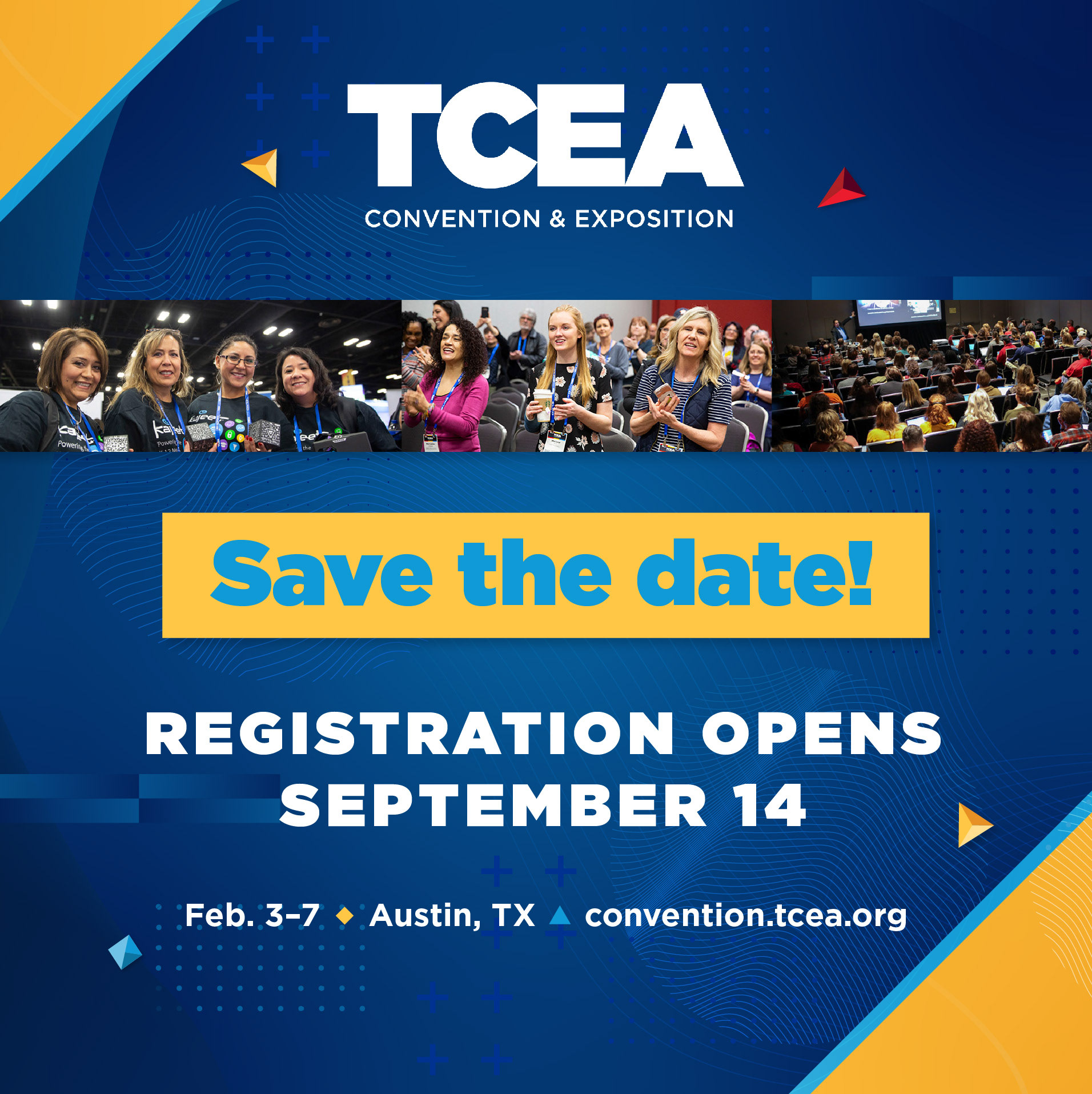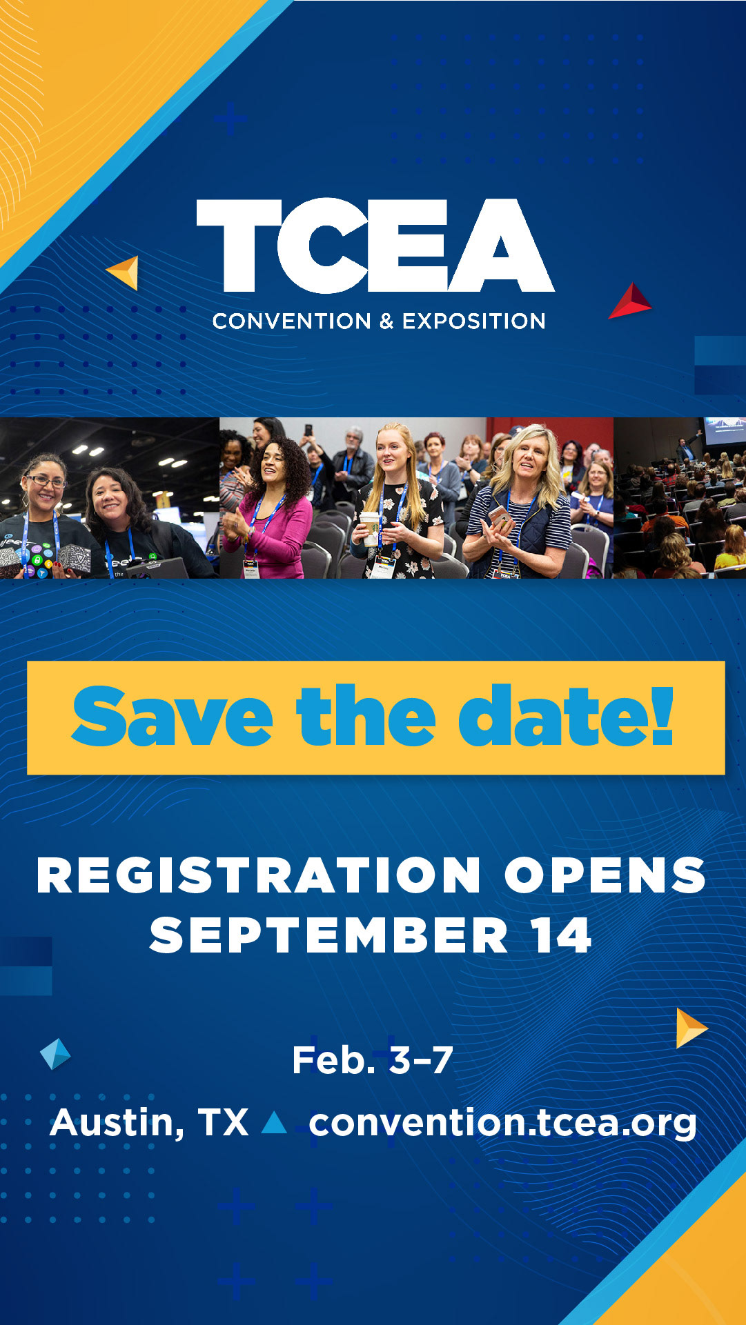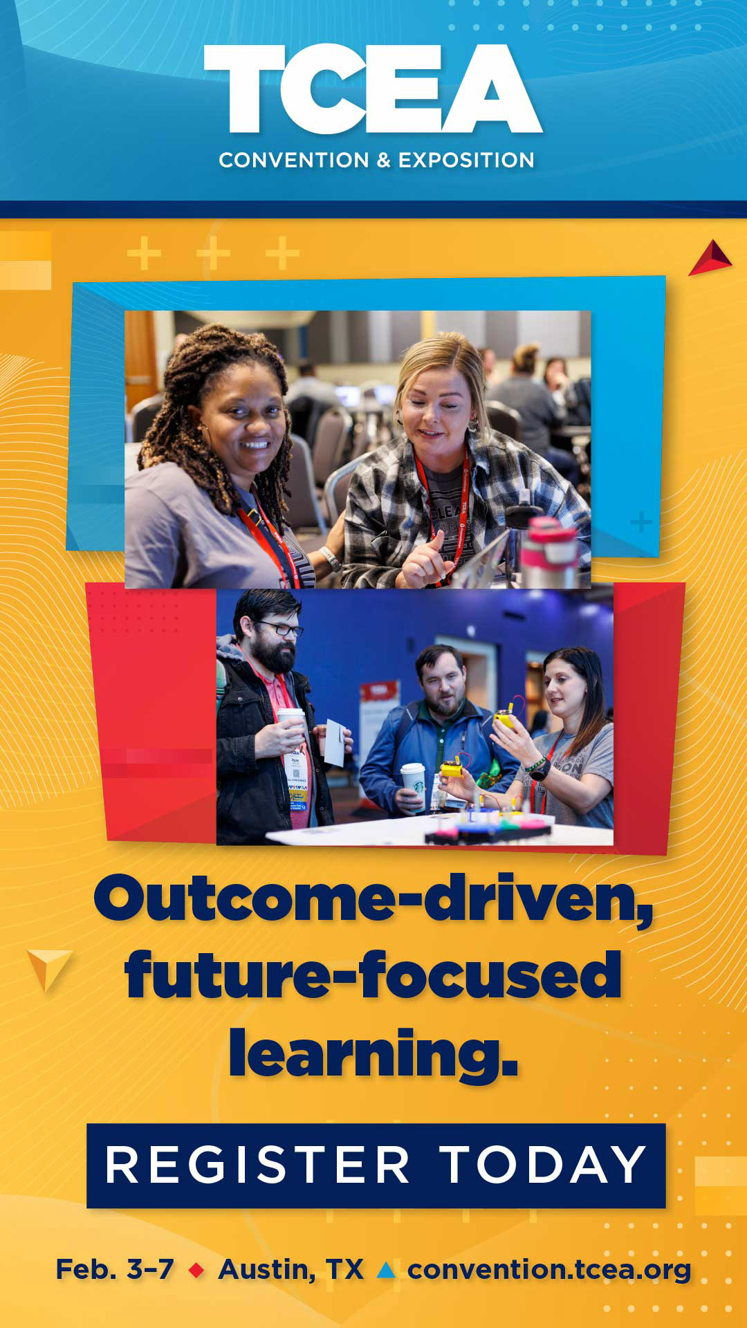 Each year, I designed the TCEA Convention brand using TCEA’s core primary red, blue, yellow, and navy colors while avoiding traditional education imagery. For 2024 I used abstract geometric textures and polygons to symbolize forward-thinking individuals and educators coming together to support one another.